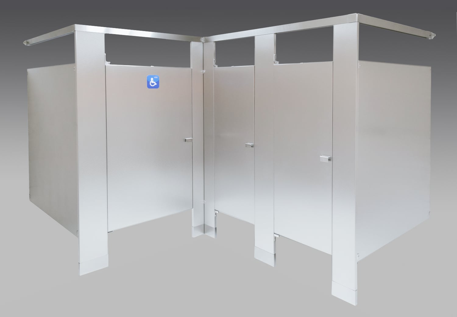 Regardless of the specific public space, this model ensures that restroom facilities remain functional, secure, and visually pleasing. Its floor-mounted design offers stability and ease of installation on various flooring surfaces. The combination of the floor-mounted pilasters and the overhead brace creates a robust structure that can withstand the rigors of high traffic, ensuring longevity and customer satisfaction.