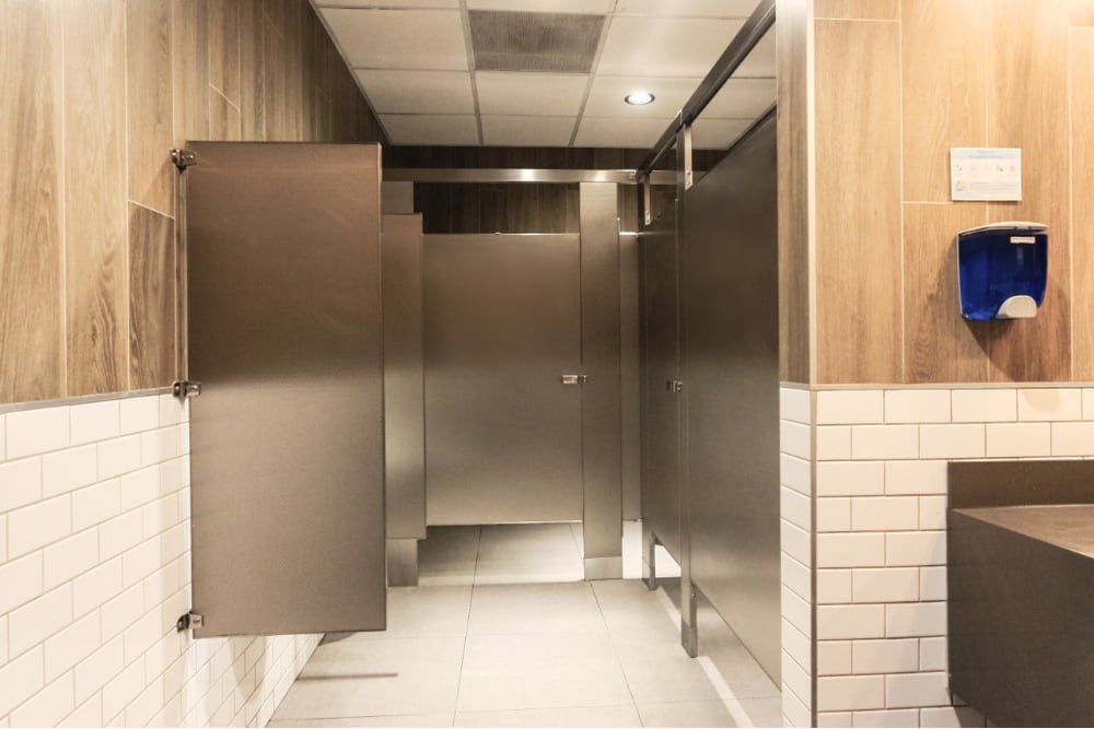 Floor mounted pilasters with an overhead brace provide an excellent solution for enhancing support and firmness in restroom facilities. This model comes highly recommended for installation in public restrooms that experience heavy foot traffic, such as schools, airports, maquila industries, stadiums, and other bustling public spaces.